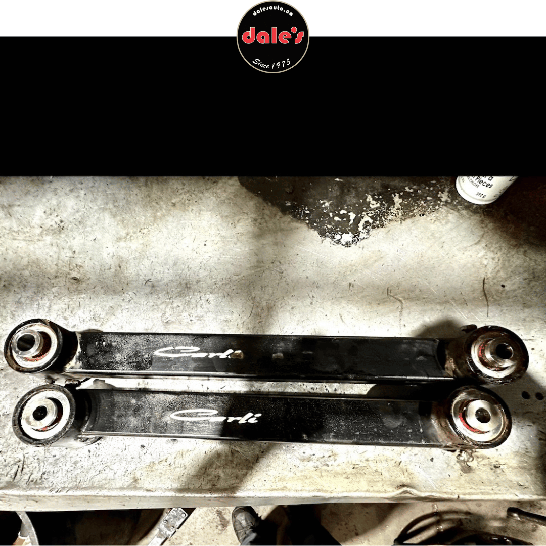 Our inspection showed: well-worn Carli lower control arm bushings, demanding a rebuild. We followed it up with a wheel alignment.